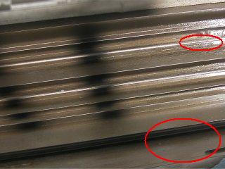 もしレール枠に穴が開いてしまったりすると、補修はかなり難しくなり、最終的にはサッシ全体を入れ替えざるを得ない状況になります。 戸車に悪影響を及ぼすレールの変形、段差、ささくれなどを極力なくした上で、今後の腐食磨耗を防ぐために再塗装をしています。 こちらが補修・修理後の写真です。先ほど見えていたアルミニウムの下地が見えなくなっています。(写真の赤丸部分) (補足) |